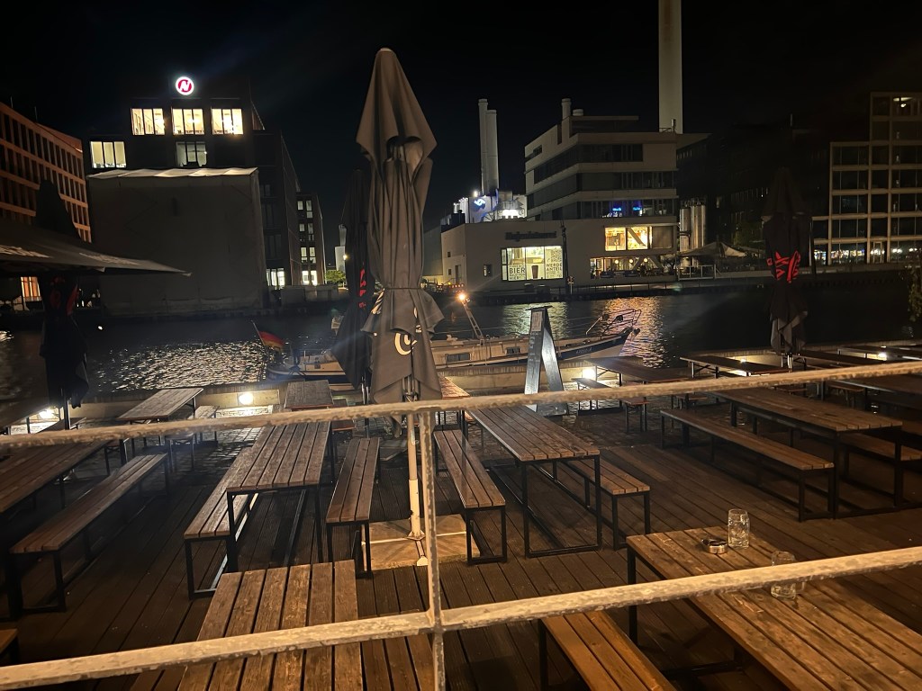 Birgit hat unterdessen eine alte Freundin und deren Mann gebeten an den Medienhafen zu kommen, die treffen wir aber nur kurz, da sie im oben erwähnten Tunnel eine Schraube in ihren Reifen gefahren haben und schnell wieder nach Hause wollen, bevor der Reifen platt wird. Also gehen wir zu dritt – nach den Düsseldorfer Liedern – in eine gechillte Location am Rhein und trinken einen Mojito auf unsere tolle Tour – es ist Birgits letzter Abend!