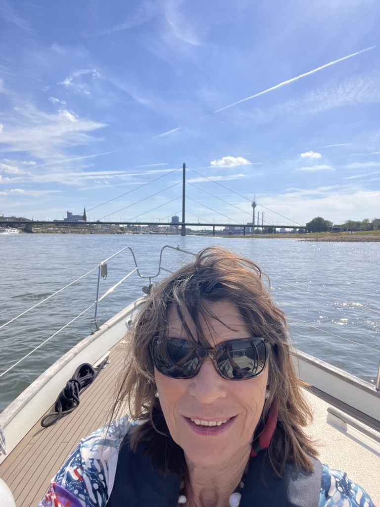 Wir passieren – nicht in bester Stimmung – 2 Brücken und endlich kommt auf der rechten Seite die Minieinfahrt zum ebenfalls kleinen Sportboothafen. Wir müssen den Rhein wieder kreuzen, um diese zu erreichen und trotz AIS kommt ein Frachter soooo schnell, dass ich das Manöver abbrechen muss. Erneuter Versuch: gegen den Strom etwa 50 m aufwärts gesteuert, da das Boot sofort vertreibt. Geschafft! Im Hafen Neuss finden wir unsere Anlagestelle nicht und machen erstmal an einem Gastliegeplatz fest. Viel Wind!