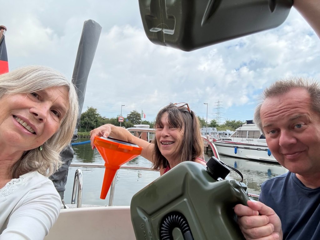 Wir füllen die 20 l Reserve ein und machen uns zu Fuß auf zur 1 km entfernten Shell Tankstelle , kaufen noch einen 10l Kanister und schleppen die 30l zum Boot, alles in den Tank und wieder los- nochmal! Birgit und Bodo gehen zwecks Reserve sogar ein 3. Mal – nicht gerade unsere Lieblingsbeschäftigung! Ich darf in der Zeit duschen – dringend erforderlich!