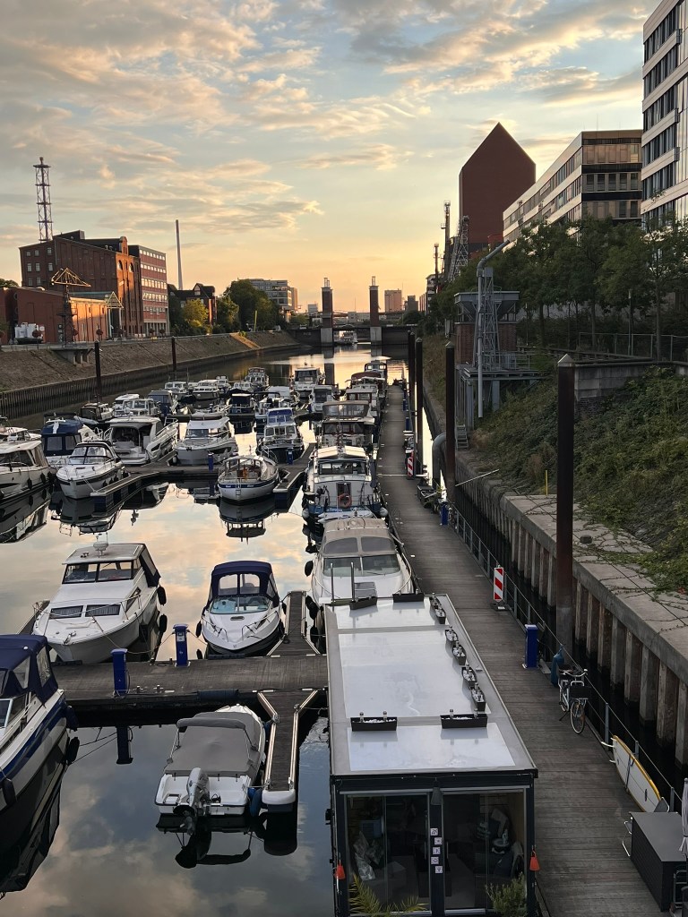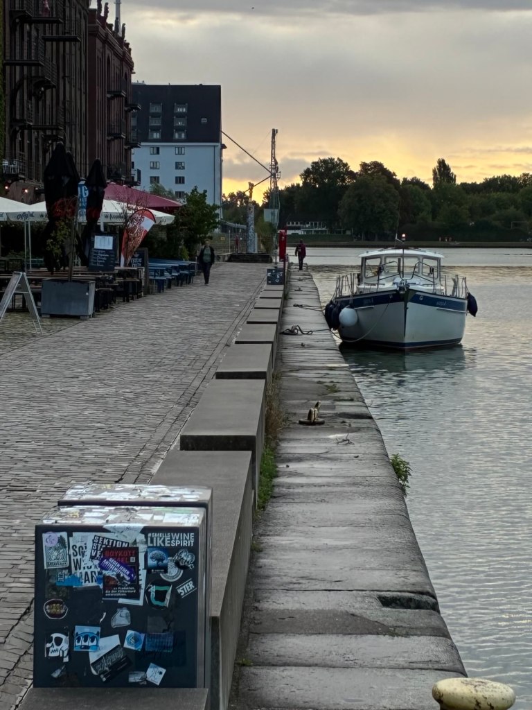 Abschied von Birgit, sehr traurig, aber sie kommt wieder und begleitet mich immer mal wieder streckenweise eine Woche…Sie gibt Mawi einen letzten Stoß, denn das Herausfahren aus dem Medienhafen ist nicht ganz ohne… aber klappt… (die Langsamkeit macht es, ich lerne).