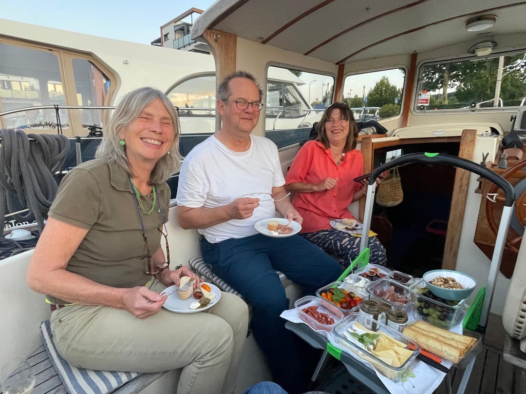 Uli und Kristina erwarten uns schon und haben ein ganzes Abendessen incl. einer Flasche Wein und einem kleinen Rolltisch mitgebracht. Supernett! Der Tisch passt perfekt ins Cockpit und es gibt ein köstliches Büffet. Wir freuen uns wirklich sehr! Danke!!!!!!!