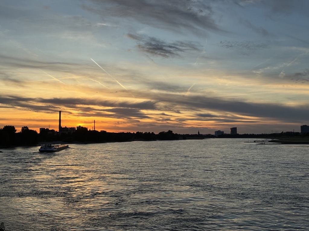 Wir düsen, düsen, düsen, düsen im Sausewind…. 9 Knoten, so schnell waren wir noch nie! Und wir haben Glück: nach etwas Nieselregen kommt vereinzelt die Sonne heraus. Und es kommen zwar reichlich Frachter von vorne, aber so gut wie gar keine von hinten – vielleicht weges des Feiertags? Auf jeden Fall viel angenehmer – ich bin auf dem Rhein trotzdem recht unentspannt und freue mich, dass Bodo deutlich relaxter als ich steuert. Zunächst geht es zurück – erneut Düsseldorf und Duisburg mit all den Industrieanlagen, erst dann kommt für uns unbekanntes Terrain.