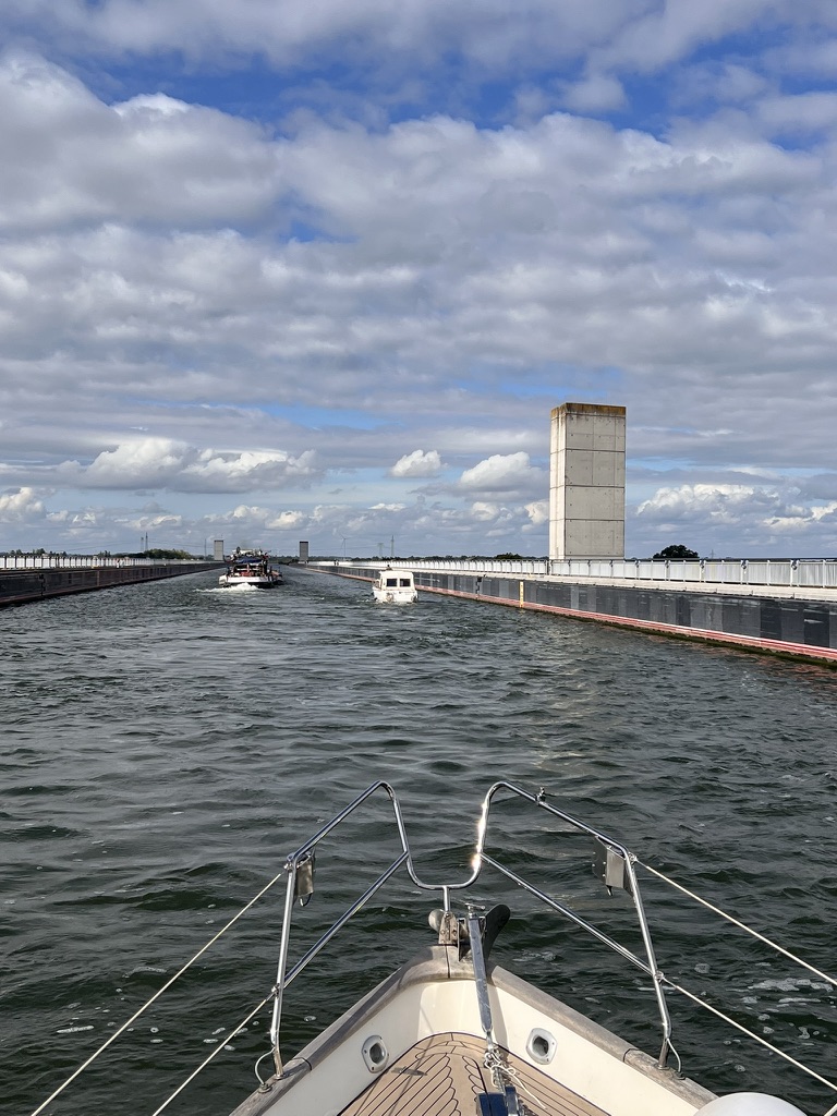 Kurz nach der Schleuse der sogenannte „Trog“ – eine Wasserbrücke über die Elbe. Alles um uns herum sieht aus wie in Schlumpfenland – wir sind höher! Sehr beeindruckend.