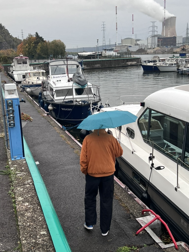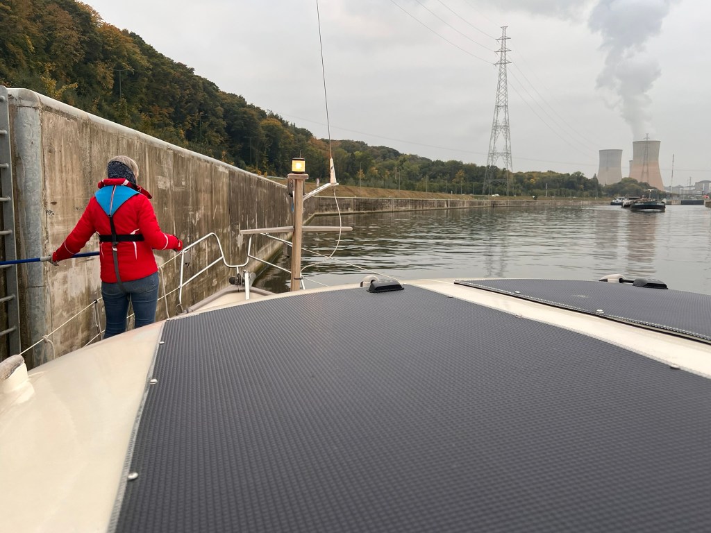 Los geht es gen Huy – das kenne ich ja schon. 3 Schleusen weiter kommen wir beim ersten Port de Plaisance (den ich noch nicht kenne) an, aber der gefällt uns nicht: eng, voll und direkt nebenan eine Kirmes (zur Erinnerung: Rummel, Volksfest). Also wieder zum bereits bekannten Atomkraftwerk… Auch diese Marina recht voll – es folgt ein – wie ich finde – spektakuläres Anlegemanöver rückwärts zwischen zwei dort liegende Boote. Ziemlich stressig! Nicht elegant, aber gut gegangen. Kaum fertig, fängt es an zu regnen.