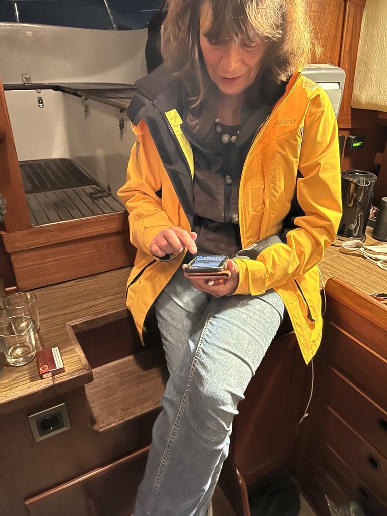 erstmal Boot verlegt, um vorwärts aus dem Hafen fahren zu können. Ich bin heilfroh, dass ich ein AIS (ein automatisches Identifizierungssystem) habe einbauen lassen. So können wir auf dem Plotter (elektronisches Navigationssystem) alle Frachter sehen, denn für die Berufsschifffahrt ist ein AIS Pflicht. Und: sie können uns auch sehen. Dass erleichtert die Einfahrten ungemein und wir können einfach eine Frachterpause abwarten.