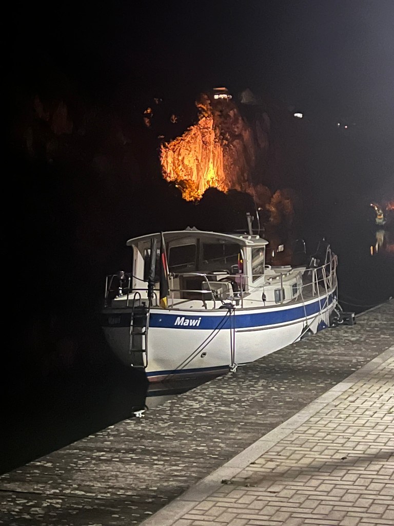 Leichter Nieselregen bis zur endlich erreichten Hafeneinfahrt und dann : eine Gewitterzelle! Peitschender Regen, Welle im Hafen, mit Scheinwerfer versucht, was zu sehen: Nichts! Gischt im Hafenbecken, welches zum Glück groß genug ist, um Kreise zu ziehen. Es ist grauenhaft und das einzige, was ich denken kann ist, dass ich – inzwischen wieder am Steuer – Mawi erneut irgendwo gegen ramme. Wir kreisen! In die eine Richtung (mit dem Wind) ist es recht ok, aber schnell, in die andere (gegen den Wind) absolut ekelhaft. Bodo leuchtet recht verzweifelt die Stege ab, er hat seine Kontaktlinsen drin, das geht etwas besser, als bei mir mit Brille – die war sofort aufgrund der Gewitterregentropfen nutzlos. Bodo findet tatsächlich die uns vom Hafenmeister genannte Stelle – am 3. Lämpchen, sagt er, mehr sehe ich sowieso nicht. Ich halte darauf zu und erkenne kurz vorher tatsächlich, wo ich hin soll. Anleger wunderbar – ich bin erleichtert, wir beide erschöpft.