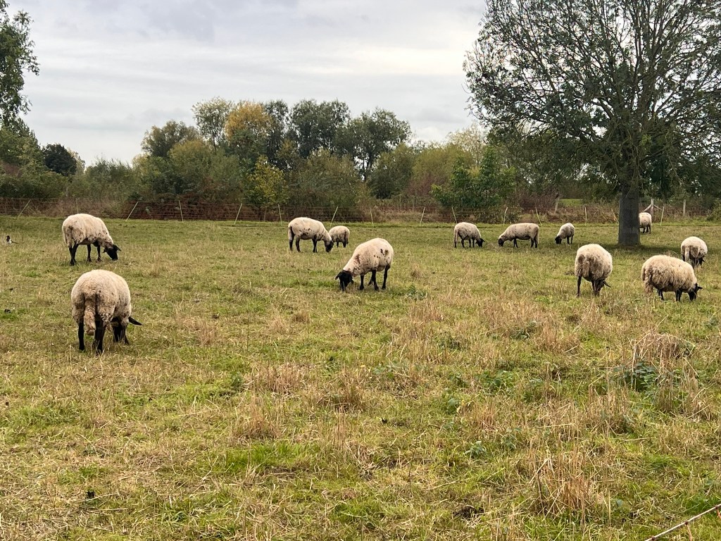 Dann durch entspannte grüne Landschaft mit vielen Schafen und Kühen.