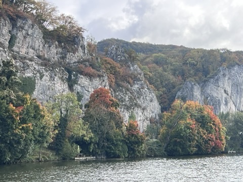 9.00 Leinen umgelegt, wir haben wenig Platz zum Ablegen so eng zwischen 2 Booten. „Eingedampft in die Vorspring“ – vorher nochmal nachgelesen, wie das geht – alles bestens. Entspannt heute durch die herbstliche Natur – Farben leuchtend à la Indian Summer. Wunderschön! 1. Schleuse mit direkt grünem Einfahrtslicht – auch wunderbar! 2. Schleuse mit Wartezeit , dann endlich auch grün. Birgit hantiert mit den Fendern, ich steuere, höre per Funk:“Maintenant non“…(jetzt nicht), schaue mich um und ein riesiges Frachtschiff rast auf den Schleuseneingang zu – unser Kurs. Ich schreie „Birgit“, aber sie hört es erstmal nicht. Ich schreie nochmal und habe das Ruder schon wieder Richtung Anlegewand gelegt. „Wir legen da nochmal an!“ – Birgit ändert alle Fender ein 2.Mal, der Frachter fährt recht knapp an uns vorbei, aber eben vorbei!!! Wir warten noch eine Schleusung ab , müssen uns von dem Schreck erstmal erholen. Wahrscheinlich reichte mein Schulfranzösich nicht, um die Schleusenwärterin korrekt zu verstehen,. Beim nächsten Mal kommuniziert ein Mann auf englisch mit uns – den hat sie nach auch ihrem Schreck bestimmt gebeten, einzuspringen. Klappt dann auch gut!