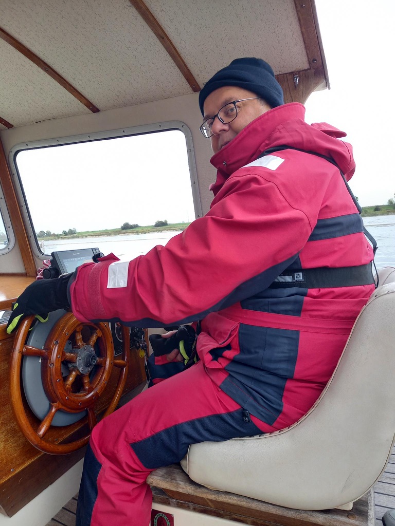 Immer wieder große Frachter, aber oft auch wir ganz allein. Und so beschließe ich den Autopiloten (Selbststeuerungsanlage des Bootes) mal auszuprobieren, denn sollte ich mal ein Stück alleine fahren, muss ich ja zwischendurch mal Leinen aufklaren oder auch den Kanal des Funkgeräts umstellen. Funktioniert tadellos – Boot fährt geradeaus. Schnell den Funkkanal tatsächlich umgestellt, Boot fährt immer noch geradeaus und ich setze mich entspannt wieder auf meinen schicken Retrokapitäninensessel, um alles zu beobachten, denn eigentlich ist der Autopilot nicht für die Fahrt auf Kanälen gedacht. Wie ich dann sehr schnell feststellen darf. ..